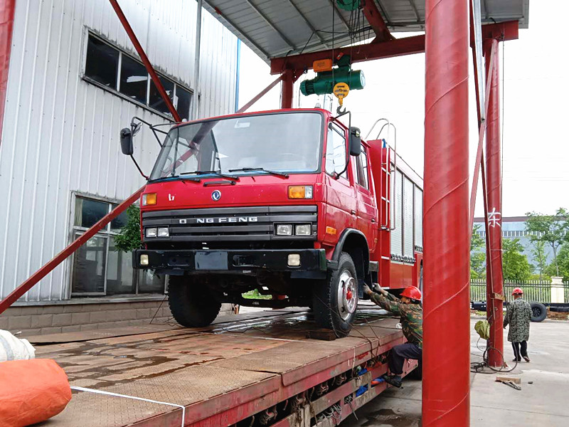 圖片為:兩臺(tái)東風(fēng)救援消防車陸續(xù)開上平板車。發(fā)往目的地